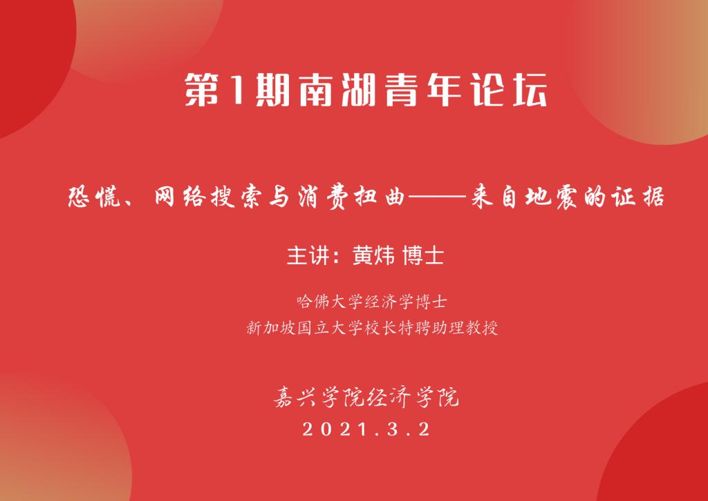 3月2日下午,第1期南湖青年论坛由哈佛大学经济学博士,新加坡国立大学校长特聘教授黄炜主讲,文雁兵教授主持,报告和讨论了论文《恐慌、网络搜索与消费扭曲——来自地震的证据》。来自我校及中山大学、浙江大学、上海财经大学、中国人民大学、东南大学、中央财经大学、西南财经大学、华南农业大学、湖南大学、浙江财经大学、南京财经大学、浙江工商大学、宁波大学等高校70余学者线上参与本次论坛。