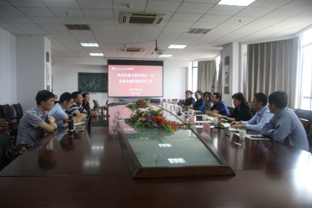 5月26日下午,必赢线路检测中心院长文雁兵、党委书记施敏颖、副院长李亚、院长助理孙庆刚及金融系、经济系、国际经济与贸易系主任一行7人赴浙江工商大学金融学院调研和交流。