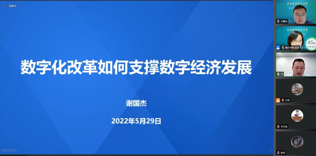 5月30日晚,必赢线路检测中心、嘉兴市经济学会、嘉兴市高层次人才联谊会以线上会议形式联合举办第1期“南湖数字经济讲堂”。数字浙江技术运营有限公司项目总监、解决方案架构师、省重点实验室方向负责人谢国杰先生应邀作学术报告,必赢线路检测中心副院长李亚主持,我校多名师生参与了线上研讨。
