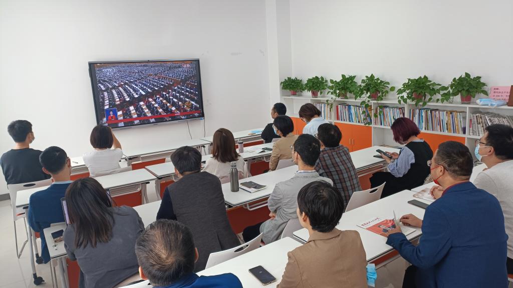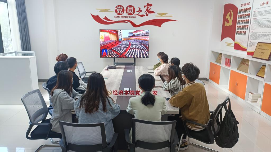在教室、在党员之家、在会议室,早早就前来收看直播的教师党员、系部主任和学生党员代表们,每个人都热切期待着党的二十大的胜利召开。直播开始后,大家聚精会神聆听习近平总书记代表中国共产党第十九届中央委员会向党的二十大作的报告,并认真记录报告要点。