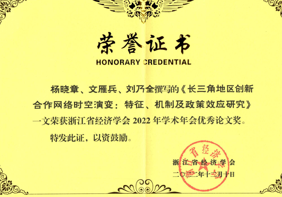本次学术年会共征集近百篇高质量论文,其中48篇论文入选线上分论坛交流。经本届年会组委会专家严格评审,我院杨晓章博士递交的学术论文《长三角地区创新合作网络时空演变:特征、机制及政策效应研究》荣获浙江省经济学会2022年学术年会优秀论文奖。