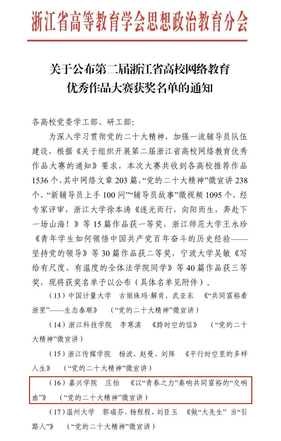近日,浙江省高等教育学会思想政治教育分会公布了第二届浙江省高校网络教育优秀作品大赛获奖名单,我院辅导员庄怡提交的“党的二十大精神”微宣讲作品《以“青春之力”奏响共同富裕的交响曲》荣获二等奖。