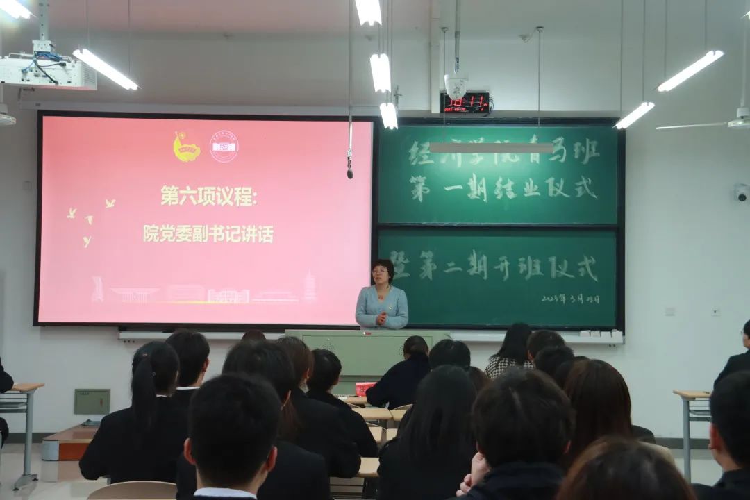 第六项议程,党委副书记讲话。院党委副书记庄美燕老师发表讲话,她对过去一年青马班开展的理论实践活动给予肯定,并对第二期青马班成员寄予厚望,希望同学们坚定理想信念、锤炼品德修养、练就过硬本领、担当时代责任,争做新时代优秀青年马克思主义者。