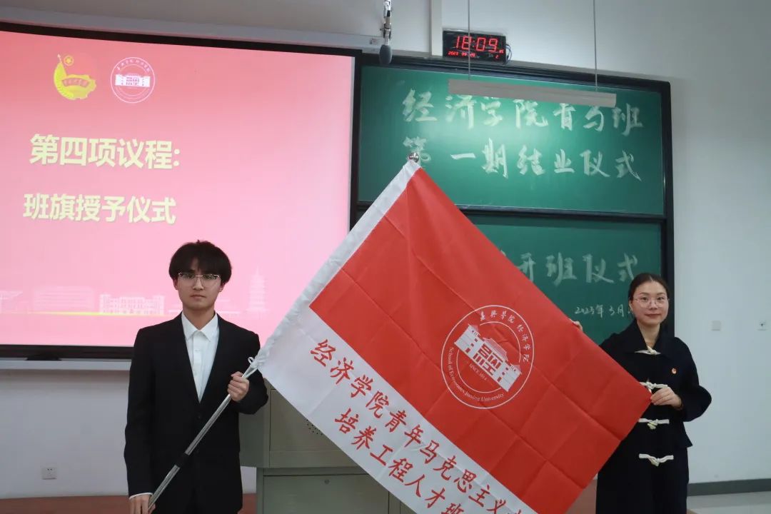 第四项议程,班旗授予仪式。由庄怡老师将青马班班旗授予第二期青马班学生代表楼康帅。