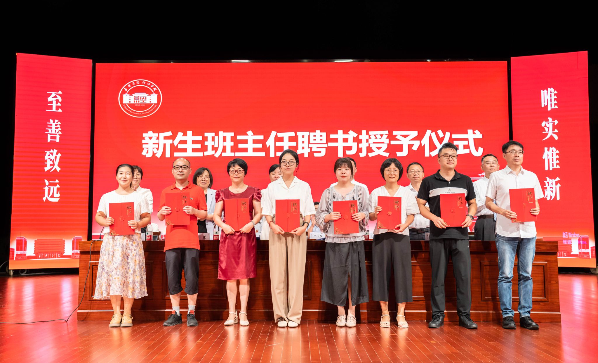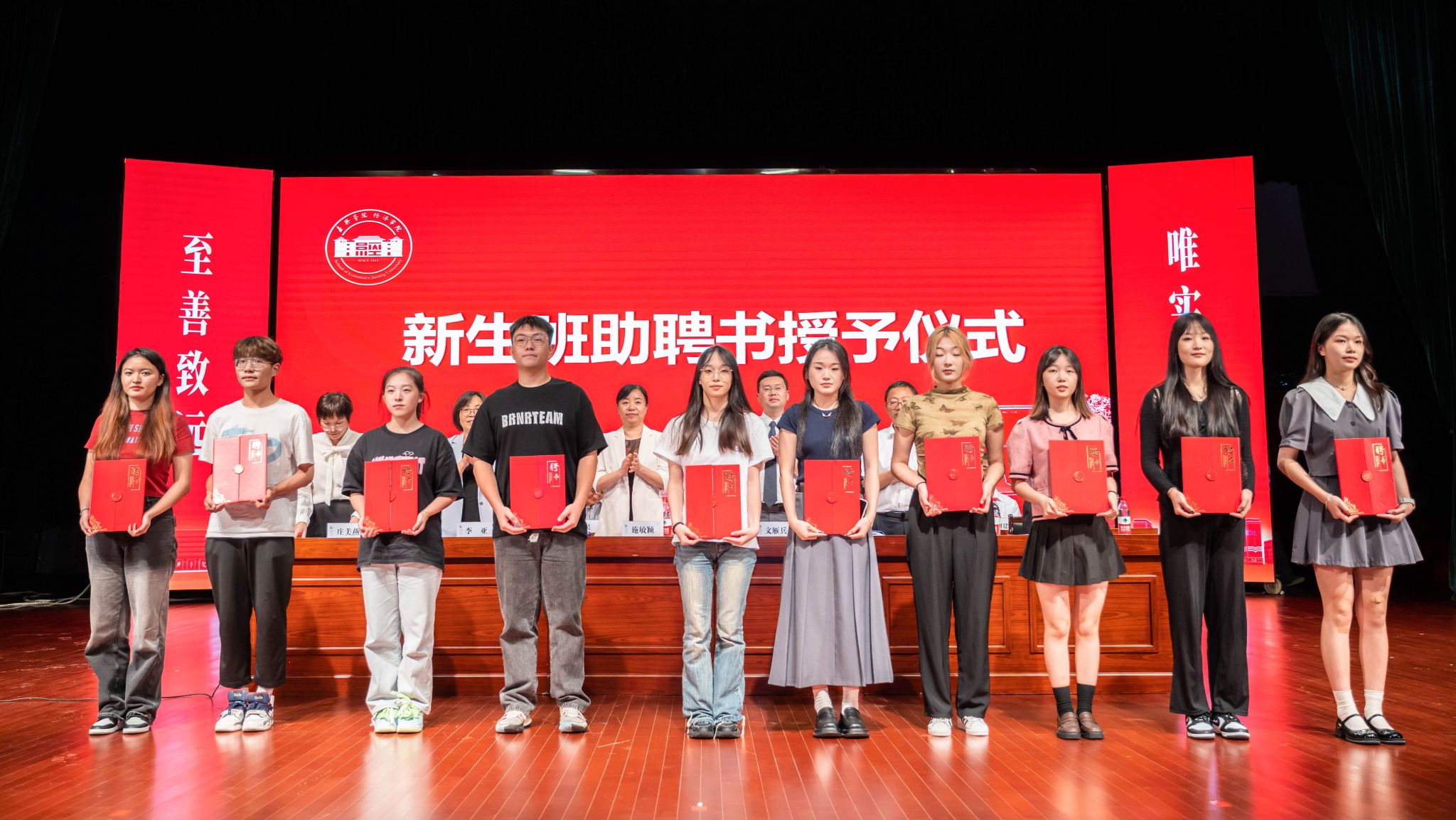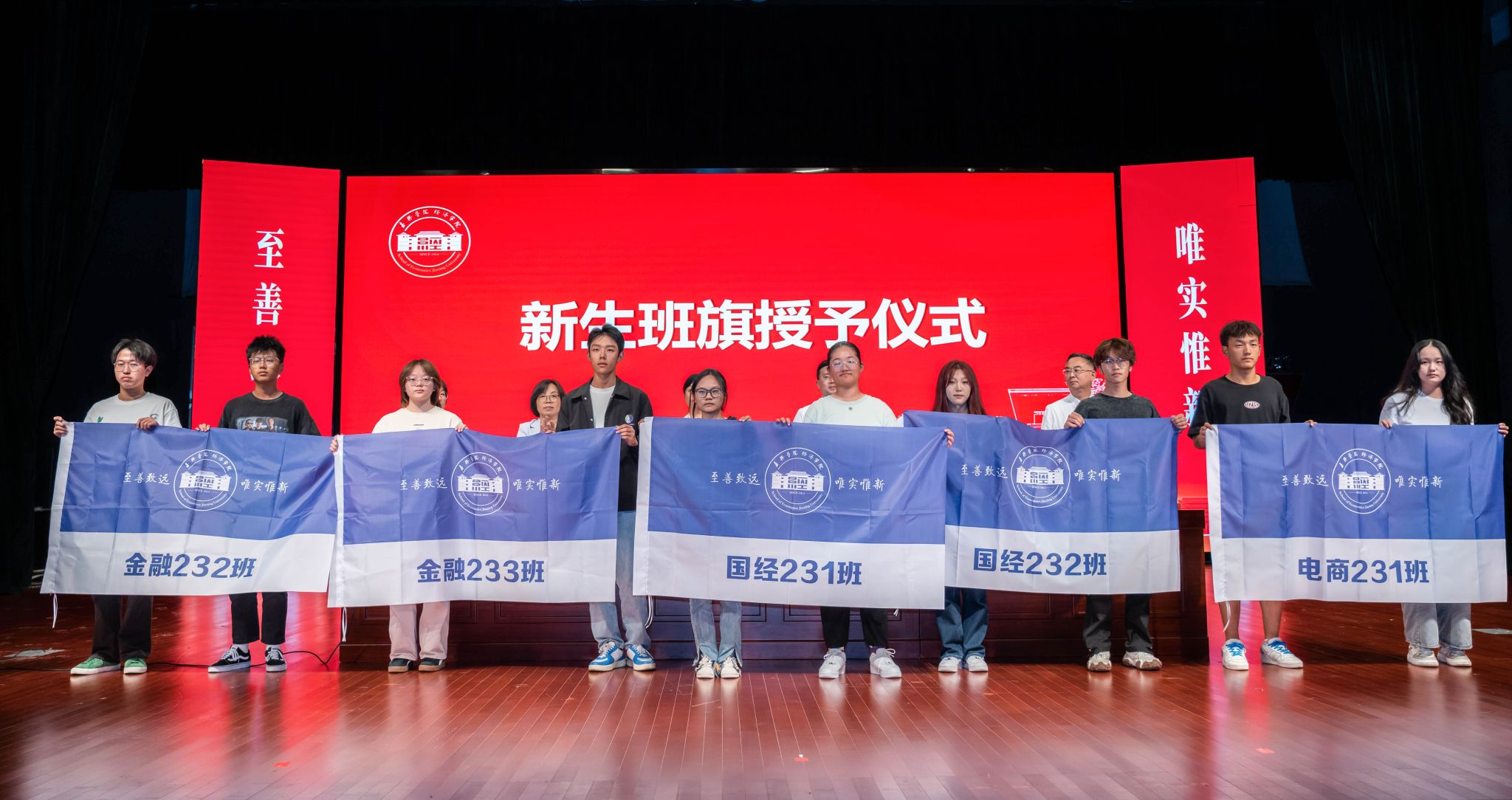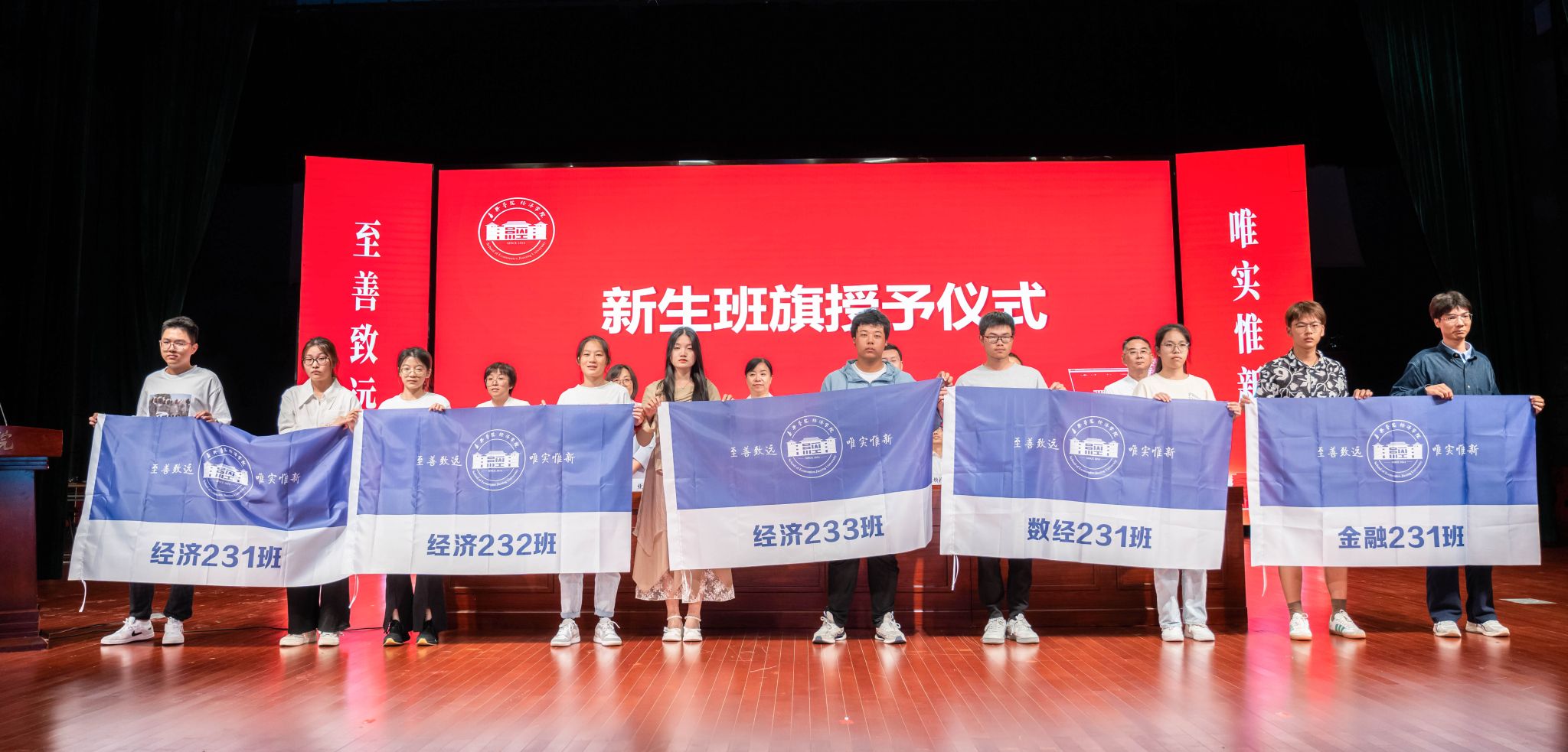 开学典礼上,学院为新生班主任及班主任助理发放了聘书,新生各班代表也展示了班级的班旗,表达了他们对大学未来四年的憧憬和期许。
