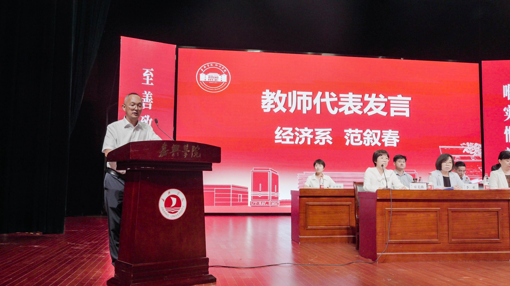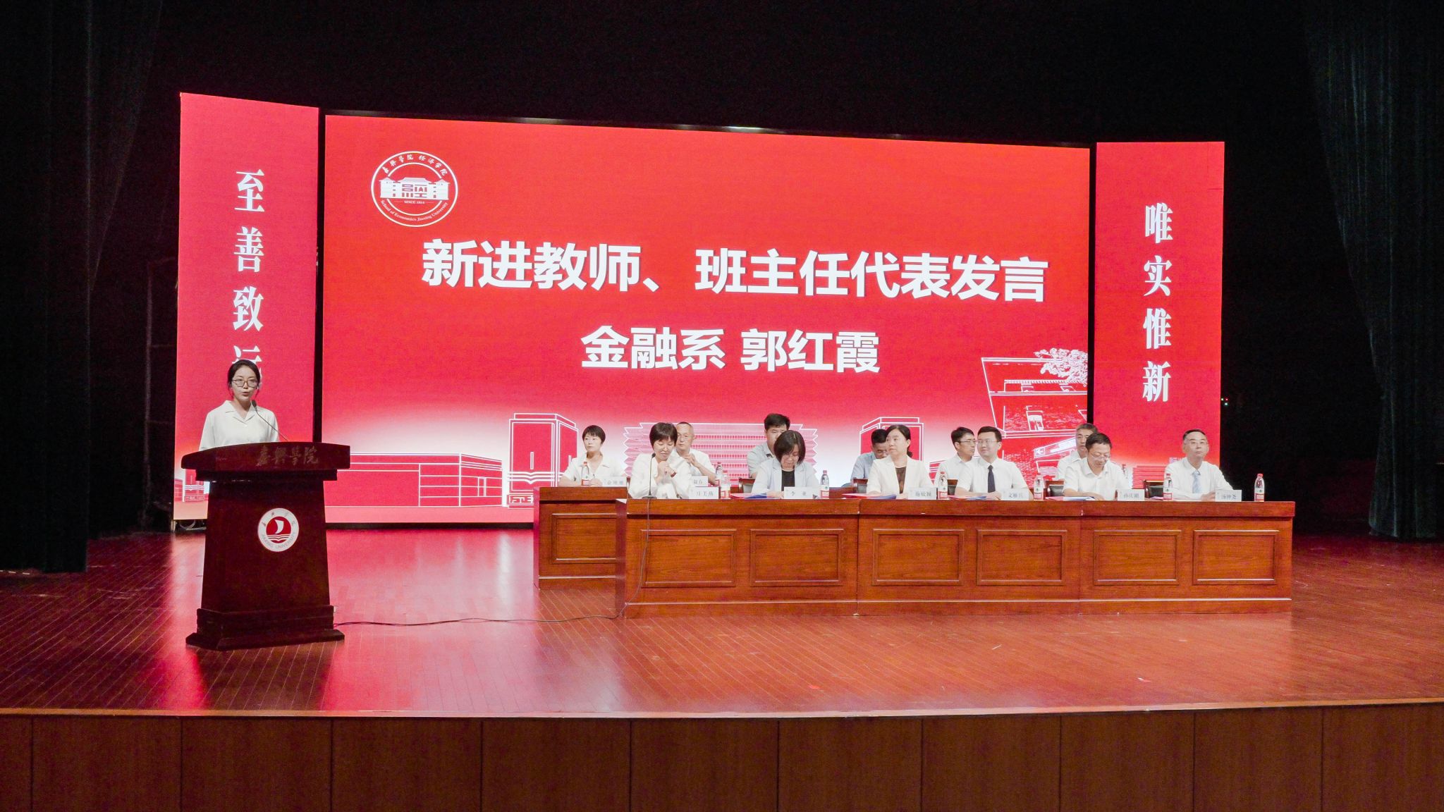 金融系老师郭红霞作为新进教师、班主任代表发言,她分享了自己的求学生涯、选择嘉兴的理由,并代表班主任们表态,立足岗位,传道授业解惑,助力成长成才。