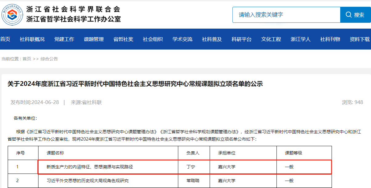 近日,浙江省哲学社会科学工作办公室公布了《关于2024年度浙江省习近平新时代中国特色社会主义思想研究中心常规课题拟立项名单的公示》。我院经济系丁宁博士主持申报的《新质生产力的内涵特征、思想溯源与实现路径》获常规课题拟立项。