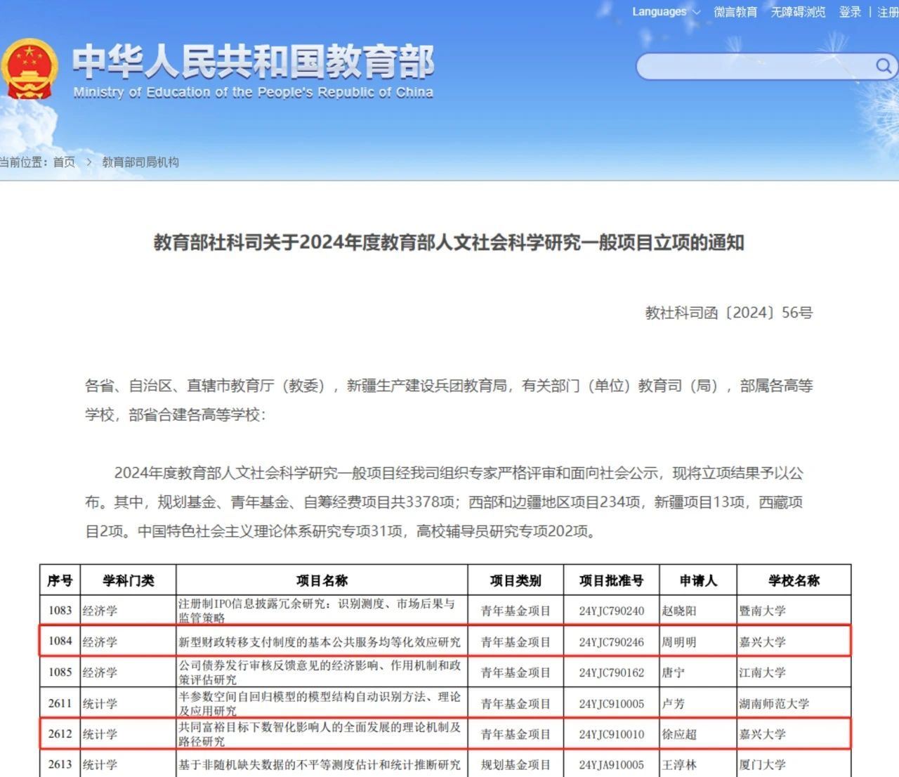 【我院喜报】我院获批2项2024年度教育部人文社科研究项目