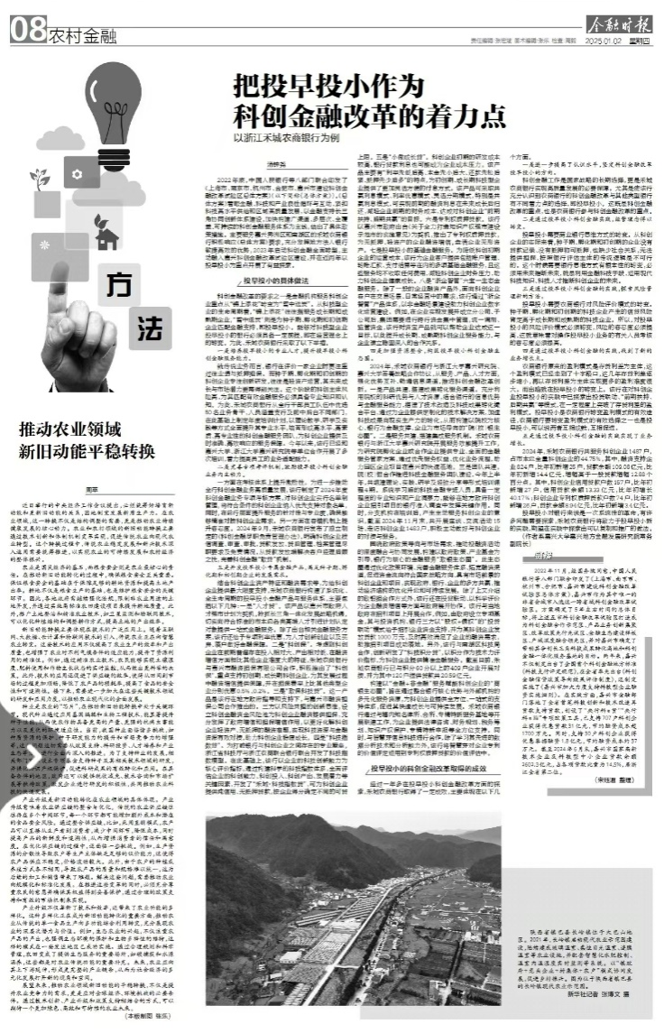 2025年1月2日,我院特聘教授、嘉兴地方金融发展研究院常务副院长汤钟尧在《金融时报》发表研究文章《把投早投小作为科创金融改革的着力点》,以浙江禾城农商行为范例,总结出“培养投早投小的专业人才,提升投早投小科创金融服务能力”“完善专项考评机制,激励投早投小科创金融业务内生动力”“开发投早投小专属金融产品,满足种子期、孵化期和初创期企业的发展需求”“加强资源整合,构筑投早投小科创金融生态圈”四点具体做法和“进一步提高了认识水平,坚定科创金融改革投早投小的方向”“经营理念得以转变”“探索风险管理新的方法”“找到了新的业务增长点”“实现了业务增长”五点成效,为银行投早投小实践提供案例支持并为嘉兴科创金融改革试验区建设贡献力量。