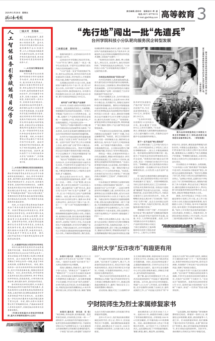 3月28日,我院钱大可博士在浙江教育报高等教育版发表文章《人工智能任务引擎赋能项目化学习》,文章认为:人工智能浪潮下,高等教育正经历着以智能化为核心的深刻变革。文章总结了教学团队借助人工智能任务引擎,从项目设计、实践、评价等多个维度,赋能项目化教学流程的举措和成效,并提出要进一步推动人工智能和教学加速融合,提升教学质量,助力创新型人才培养。