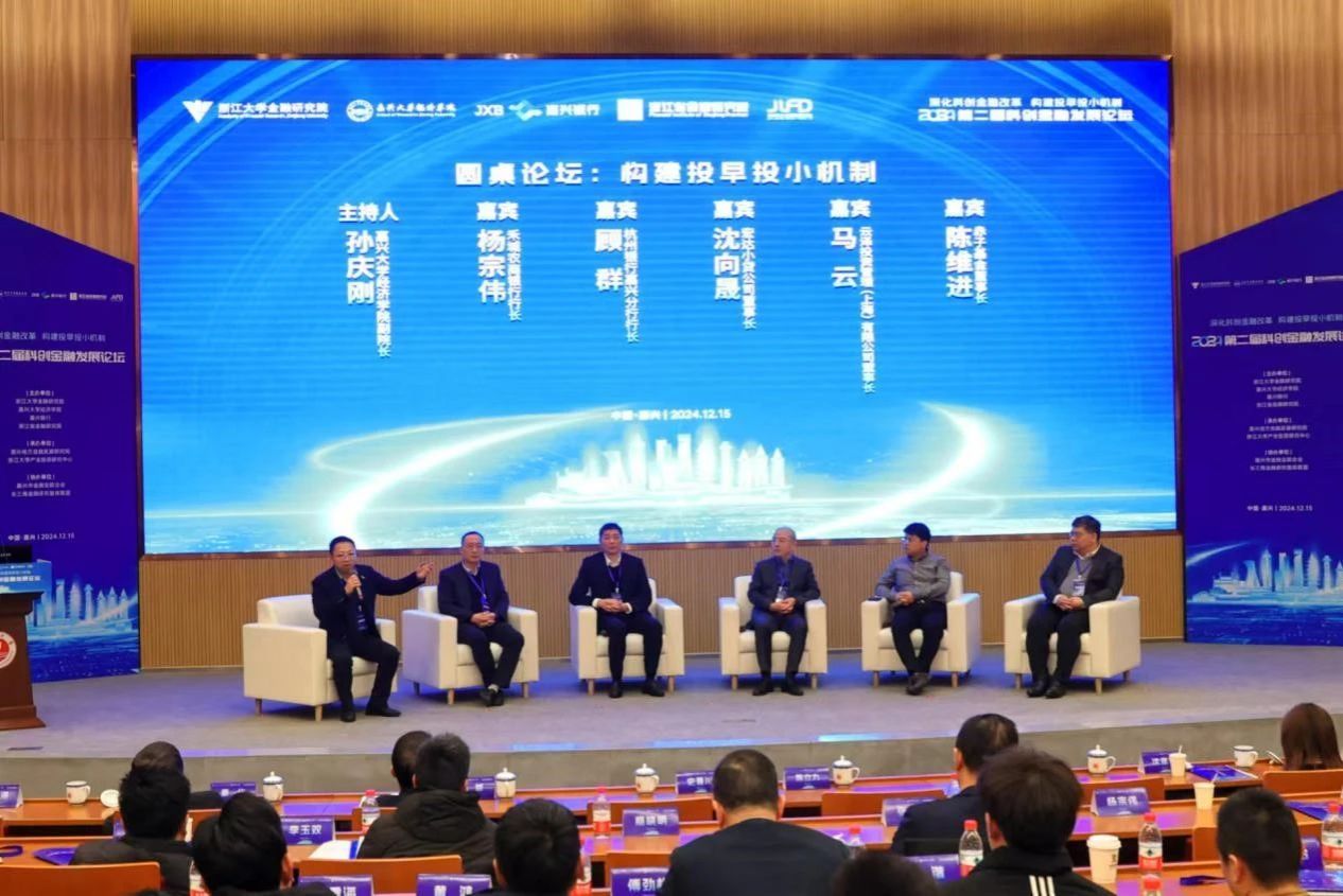圆桌论坛环节,禾城农商银行行长杨宗伟、杭州银行嘉兴分行行长顾群、宏达小贷公司董事长沈向晟、云泽投资管理(上海)有限公司董事长马云、赤子基金董事长陈维进五位嘉宾从自身行业领域视角,围绕“构建投早投小机制”,分享了典型案例与工作实绩,并就解决当前投早投小的难点、堵点、卡点提出了新颖独到的观点和建议,引起与会成员的强烈共鸣和得到大家一致认同。圆桌论坛由必赢线路检测中心副院长孙庆刚教授主持。