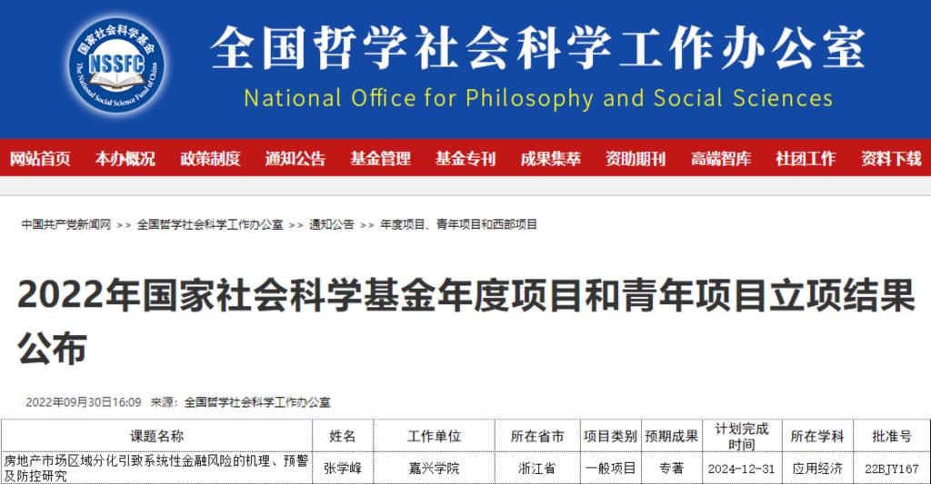 近日,根据全国哲学社会科学工作办公室《2022年国家社会科学基金年度项目和青年项目立项结果公布》的通知,我院张学峰副教授主持的《房地产市场区域分化引致系统性金融风险的机理、预警及防控研究》获批一般项目立项。