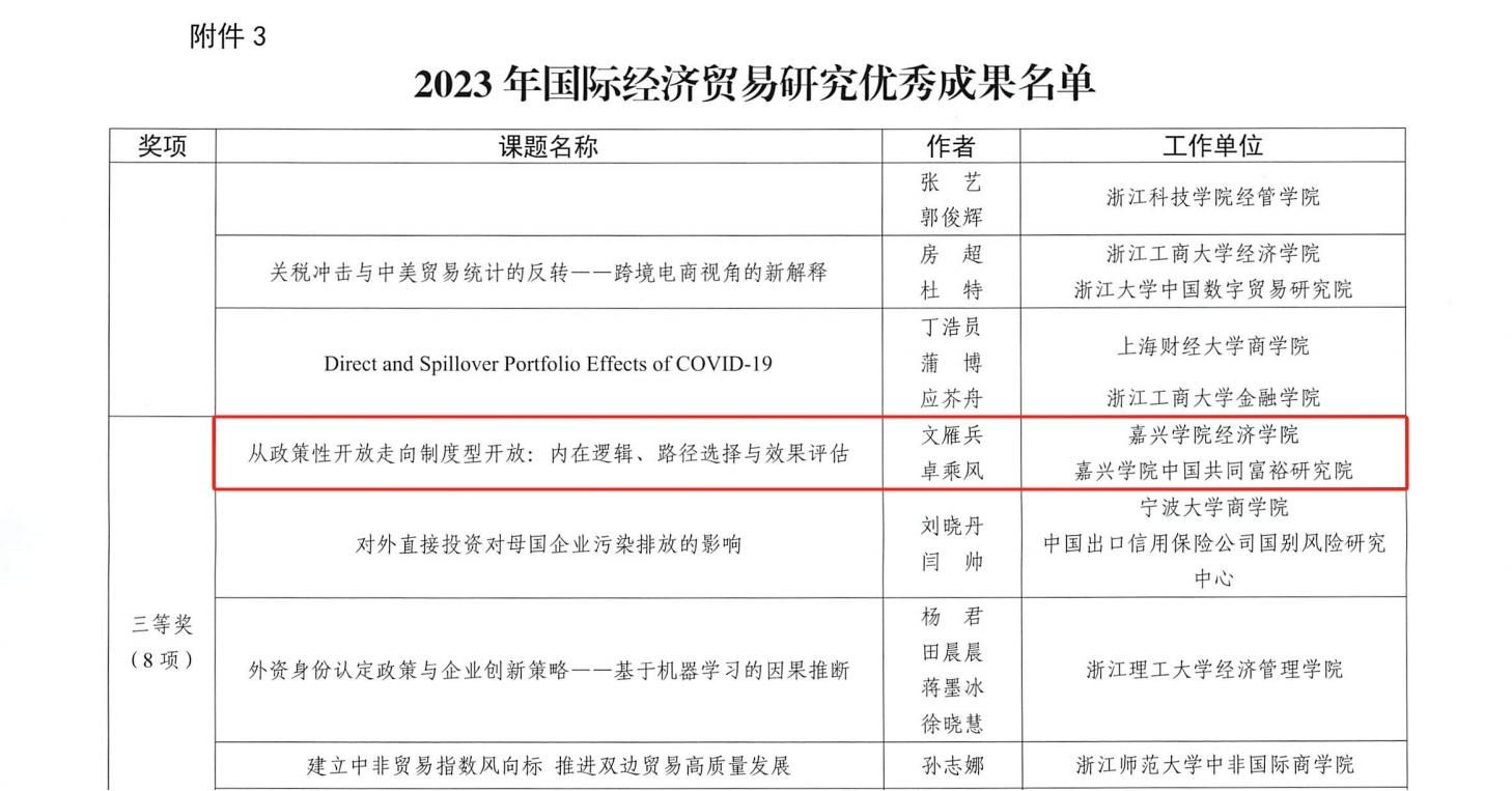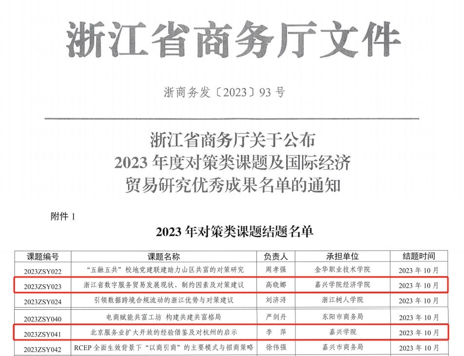 近日,浙江省商务厅发布《浙江省商务厅关于公布2023年度对策类课题及国际经济贸易研究优秀成果名单的通知》(浙商务发〔2023〕93号),我院高晓娜博士、李萍副教授主持完成的两项课题顺利结项,其中高晓娜博士主持的《浙江省数字服务贸易发展现状、制约因素及对策建议》获2023年对策课题三等奖;文雁兵教授和卓乘风博士的合作成果《从政策性开放走向制度型开放:内在逻辑、路径选择与效果评估》获2023年国际经济贸易研究优秀成果三等奖。