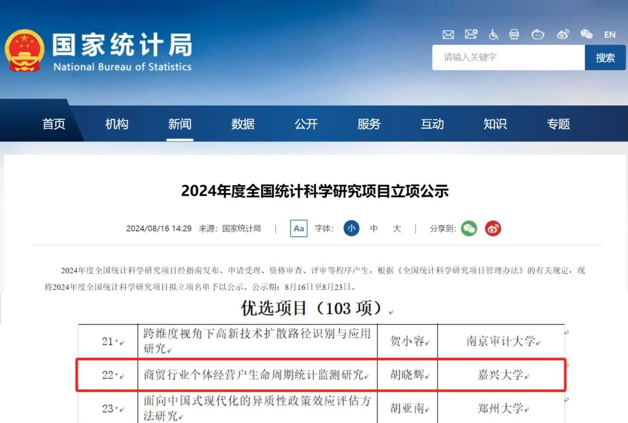 近日,国家统计局发布了《2024年度全国统计科学研究项目立项公示》,我院胡晓辉副教授申报的《商贸行业个体经营户生命周期统计监测研究》获批全国统计科学优选项目立项。这是我院首次获批国家统计局研究项目。