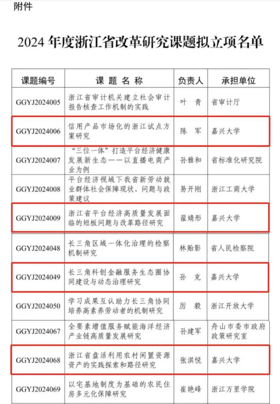 近日,中共浙江省委全面深化改革委员会办公室公布了《2024年度浙江省改革研究课题拟立项名单》。我院陈军教授主持的课题《信用产品市场化的浙江试点方案研究》、翟婧彤博士主持的课题《浙江省平台经济高质量发展面临的短板问题与改革路径研究》、孙克教授主持的课题《长三角科创金融服务生态圈协调建设与动态治理研究》、张淇悦博士主持的课题《浙江省盘活利用农村闲置资源资产的实践探索和路径研究》获得拟立项。
