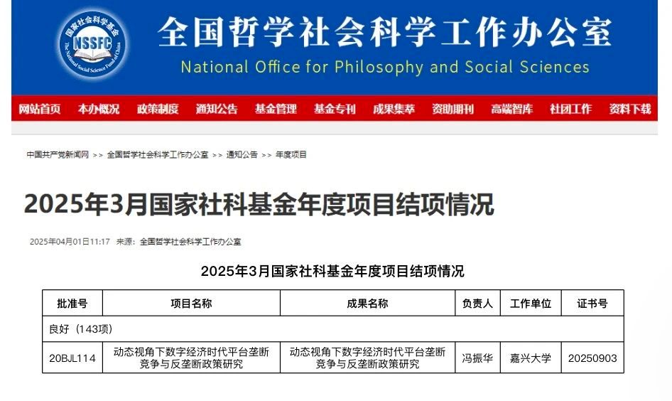近日,我院冯振华副教授主持的国家社科基金一般项目“动态视角下数字经济时代平台垄断竞争与反垄断政策研究”顺利通过验收审批,鉴定等级为良好