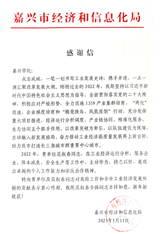 近日,嘉兴市经济和信息化局发来感谢信,对我院挂职教师范叙春教授表达感谢和提出表扬。