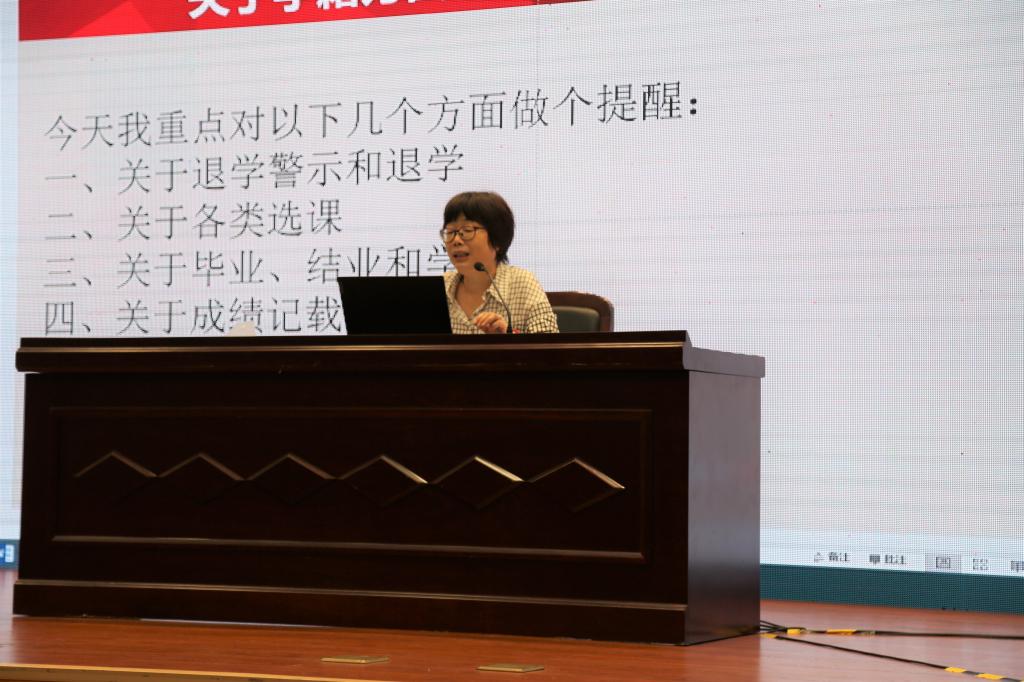 曹小英从大学生要学会自我管理、自我服务的角度出发,就退学警示和退学、各类选课、毕业要求、成绩记载等方面展开分享,列举了大量真实案例提醒同学们,要重视课程学习、关注考试安排,确保在大学四年后能获取双证。