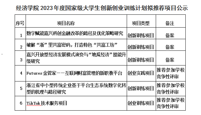 根据学校教务处《关于开展我校国家级大学生创新创业训练计划2023年度项目申报的通知》要求,学院组织开展了项目申报工作。经项目组申报、学院组织专家评审,拟推荐3个项目为2023年度国家级大学生创新创业训练计划备案项目,拟推荐3个项目参加学校组织的竞争性评审,现予以公示。