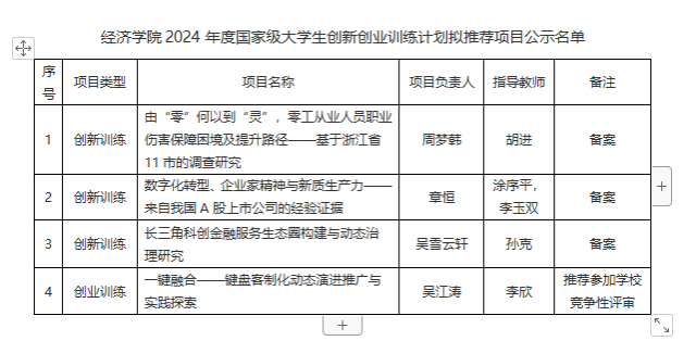 根据学校《关于开展嘉兴大学国家级大学生创新创业训练计划2024年度项目申报的通知》要求,经项目组申报、学院审核,拟推荐3个项目为2024年度国家级大学生创新创业训练计划备案项目,拟推荐1个项目参加学校组织的竞争性评审,现予以公示。