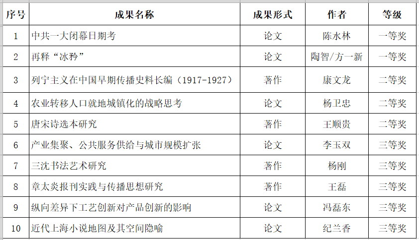 根据《我校哲学社会科学优秀成果评奖办法》(见附件)有关要求,经个人申报、部门审核,并经通讯评审、评奖委员会评审、校学术委员会审定,《中共一大闭幕日期考》等十项成果为拟奖励成果,现予以公示,公示时间为10月8日至10月13日,公示期间如有异议,请按照我校哲学社会科学优秀成果评奖办法》第九条“异议处理”有关规定如实反映。
